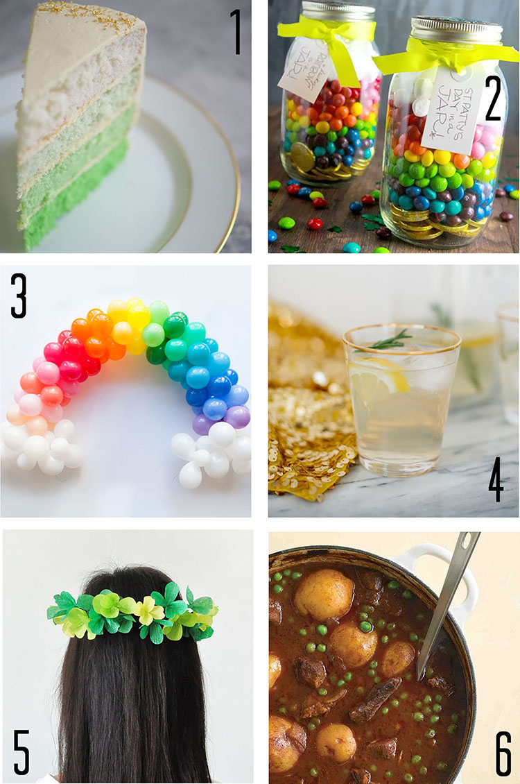 1. Green Ombre Cake / 2. Candy Jar Favour / 3. Mini Rainbow Arch / 4. Pot of Gold Punch / 5. Paper Shamrock Crown / 6. Irish Stew