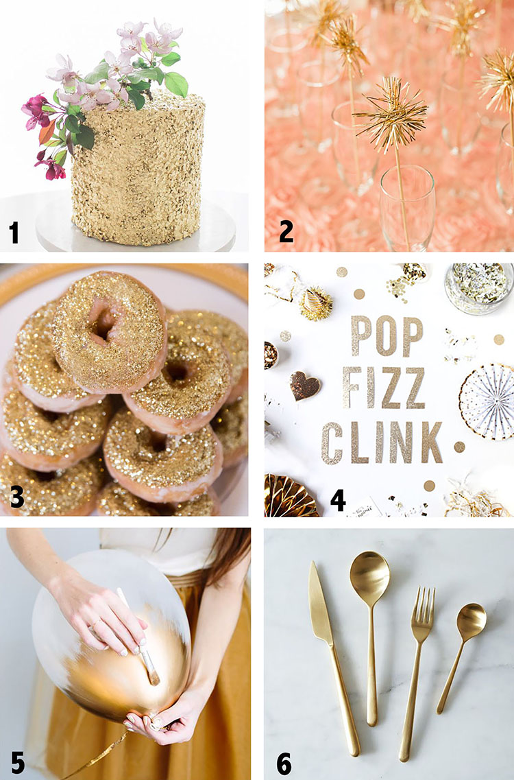 1. Sequin Cake / 2. Drink Stirrer / 3. Glittery donuts / 4. Bannerie Garland / 5. Painted Balloons / 6. Gold Cutlery