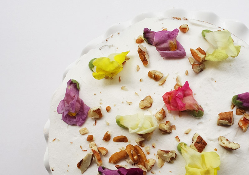Leave your cakes to cool for about an hour in the tin before you turn them out and then leave them to cool for a further 30 minutes. While your cakes are cooling you can get going on your coconut cream frosting. Take your solid coconut cream and put it in the bowl of your stand mixer - leaving the liquid in the tin. You can then go full tilt with your whisk attachment until the cream is light and airy, slowly adding your icing sugar and then your vanilla essence. For a cream cheese kind of flavour whisk in a bit of lemon juice…and tada! Place your coconut goodness in the fridge until you are ready to ice your cakes. I did a 4 layer cake so I divided my coconut cream up and wedged it between the layers, using the rest to cover the top and sides, I then topped my cake with some edible flowers and chopped pecans. I am quite thrilled and obsessed with this cake, it is such an easy and wonderful treat to whip up for someone you love, including one’s self!