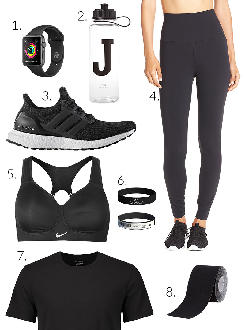 1. Apple watch / 2. Water bottle / 3. Adidas Ultra Boost / 4. Nike Legendary leggings / 5. Nike Rival sports bra / 6. Park Run band / 7. Plain black tee / 8. Kinesiology tape